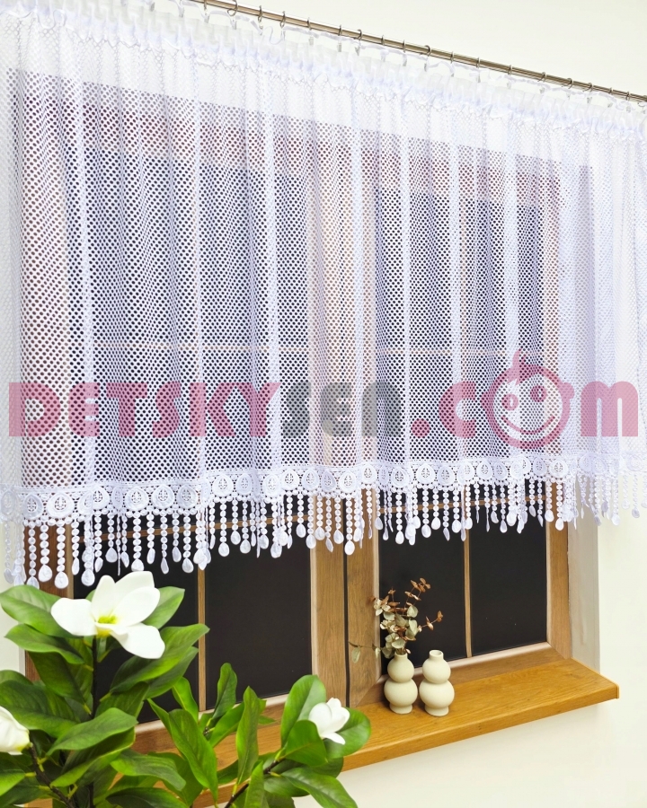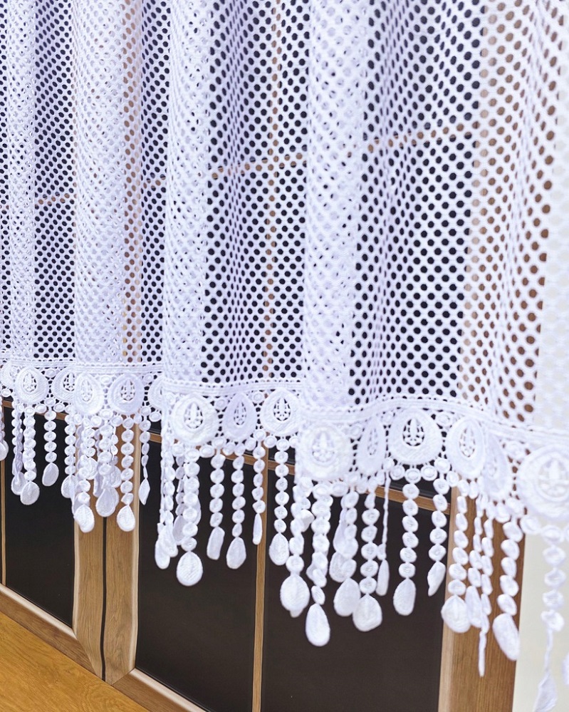 Záclonu v dolní části zdobí vzorové zavěšení.