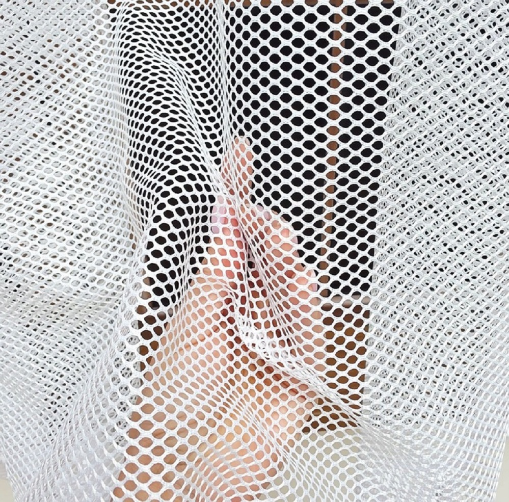 Jednoduchá záclonka se síťovaným vzorem, který propouští do místnosti světlo.